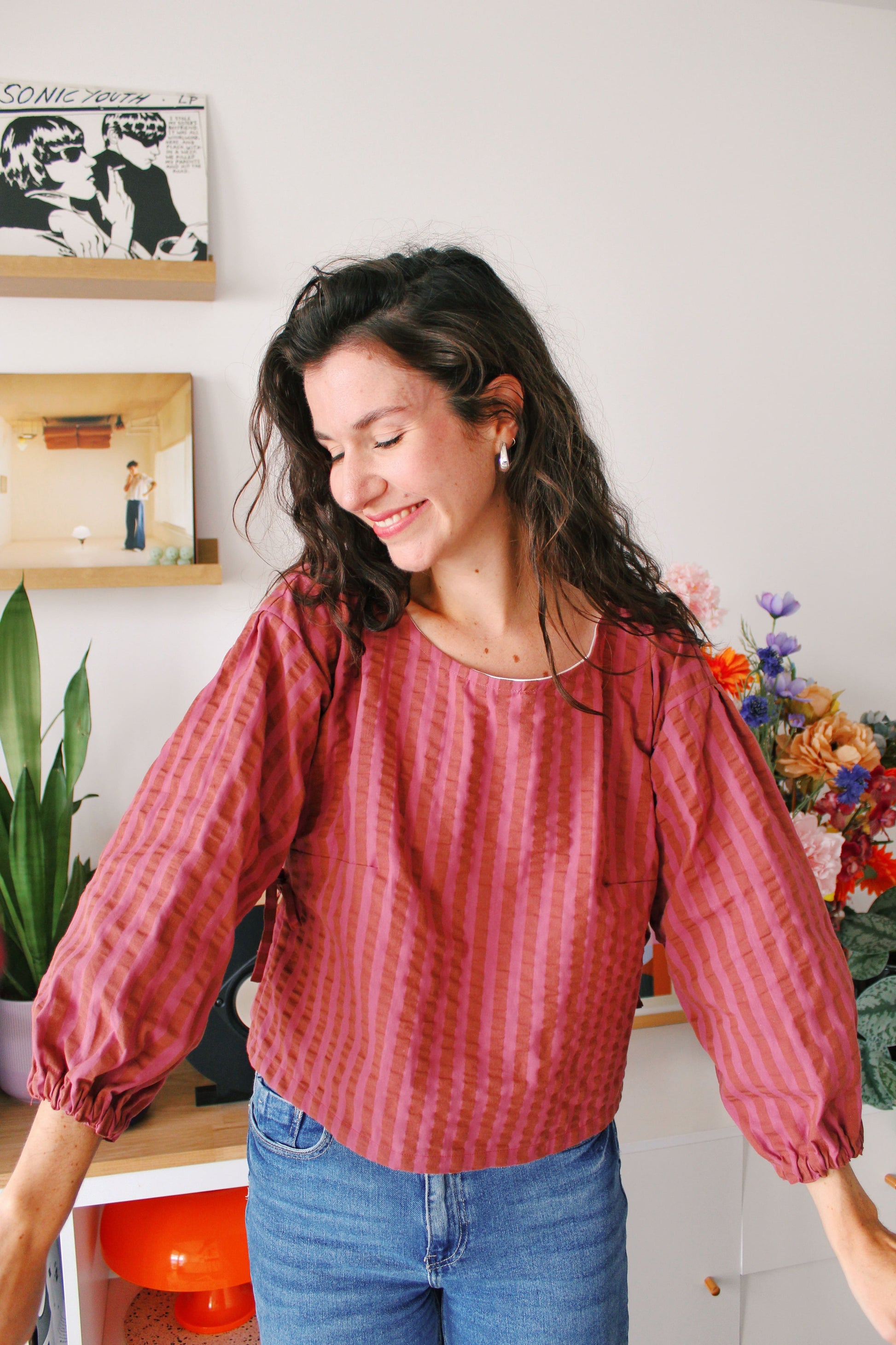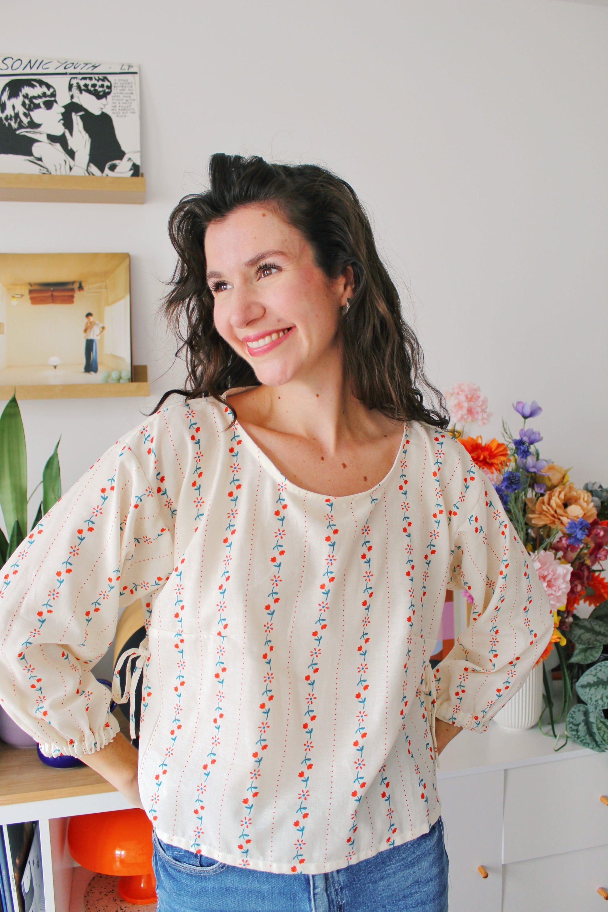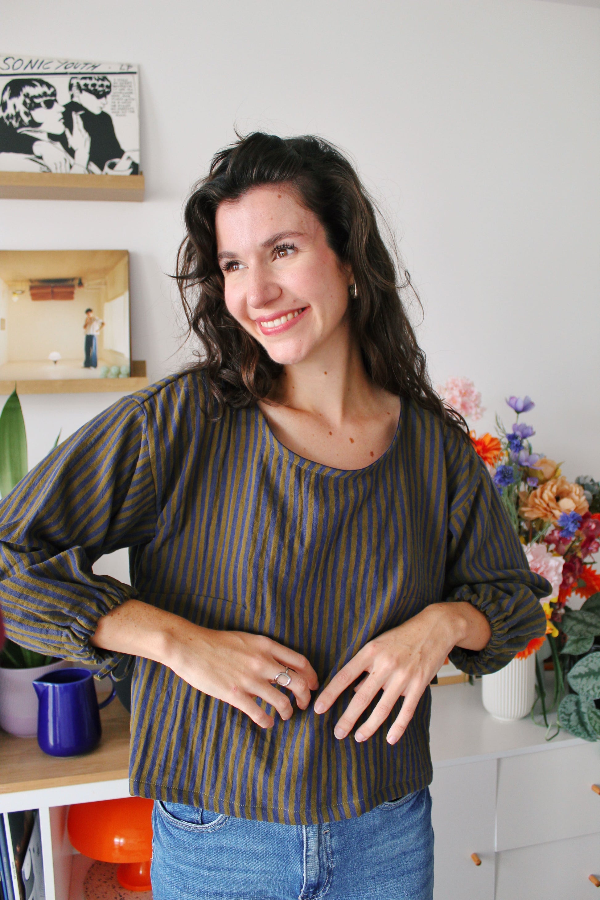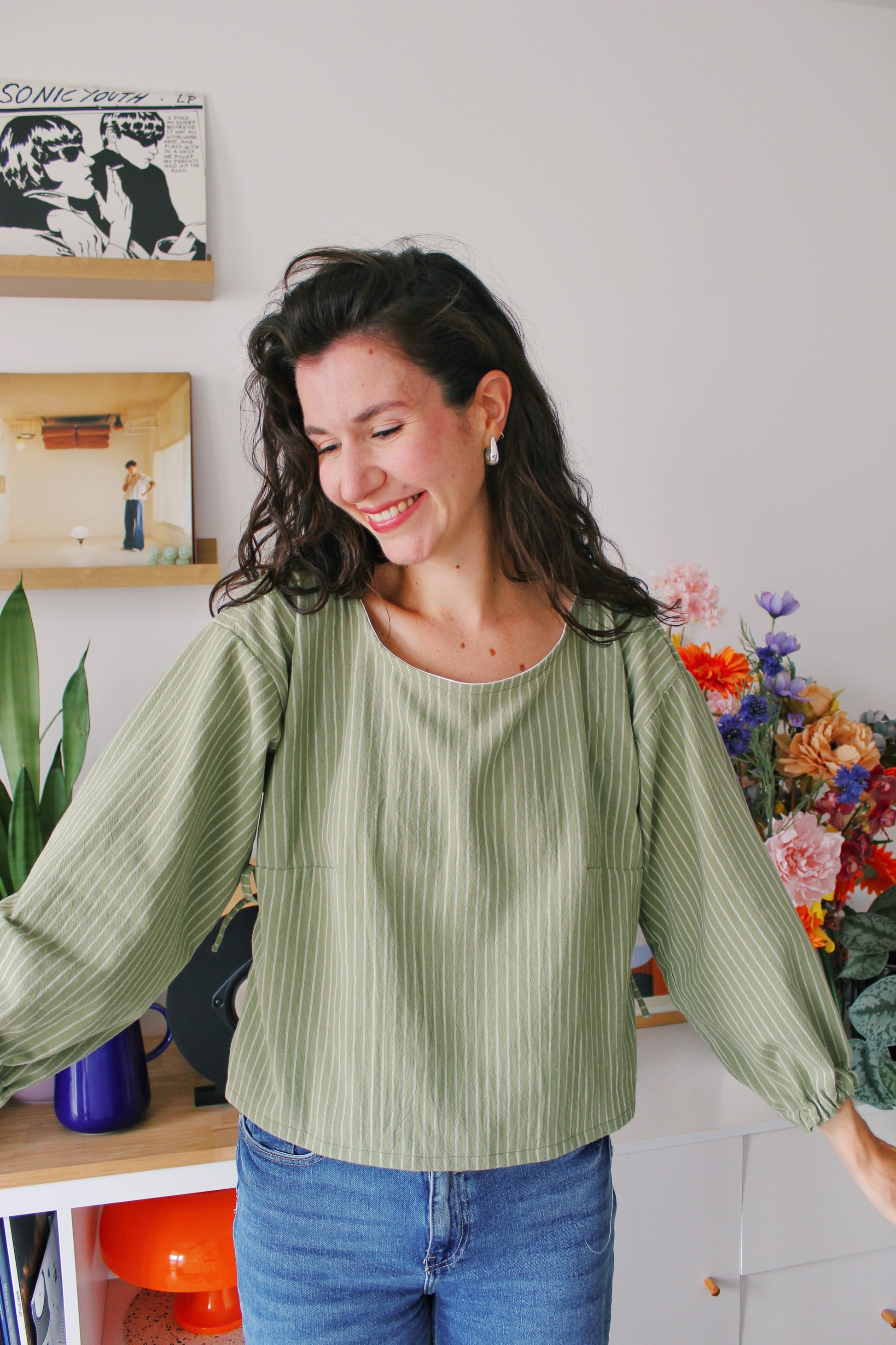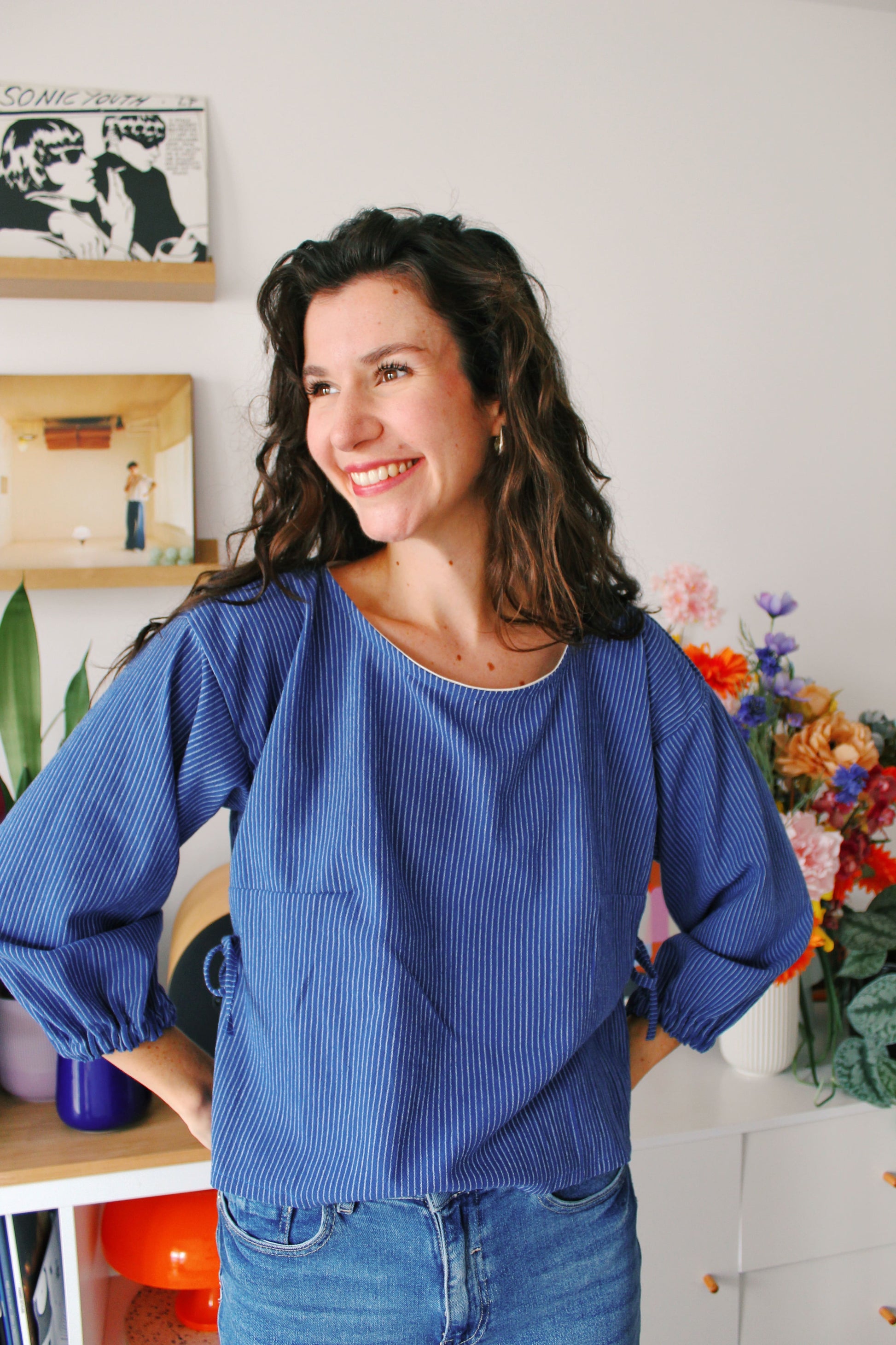 Chaque Blouse Madeleine est entièrement cousue à la main dans mon atelier à Lille, en 3 heures de travail minutieux, toujours accompagnée d’un bon matcha 🍵