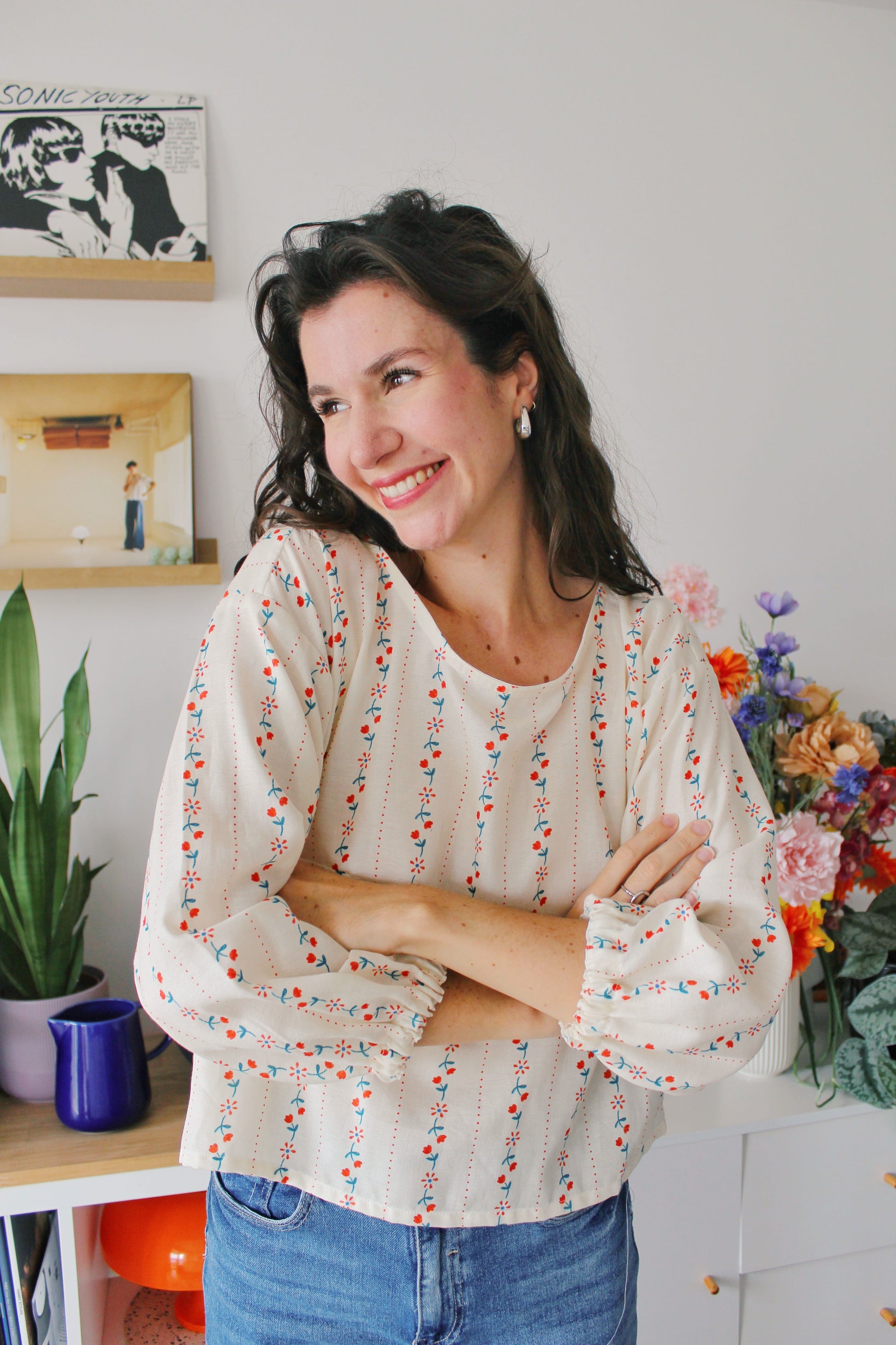 Ses manches 3/4 légèrement gonflées lui donnent un air délicieusement rétro, tandis que sa coupe oversize assure une aisance parfaite au quotidien.
